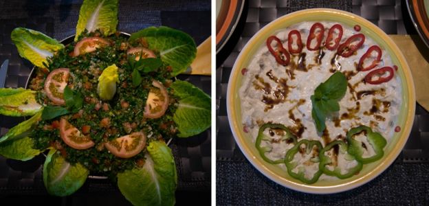 Image captionالتبولة (يسار) والمتبل (يمين) من إعداد ماجدةحينما جاءت إلى لندن في البداية، كانت ترغب ماجدة في الحديث إلى كل شخص تقابله عن الحرب، معتقدة أنهم لا يفهمون الصورة الكاملة، لكنها وجدت أن ذلك يسبب الإحباط والإرهاق للناس.