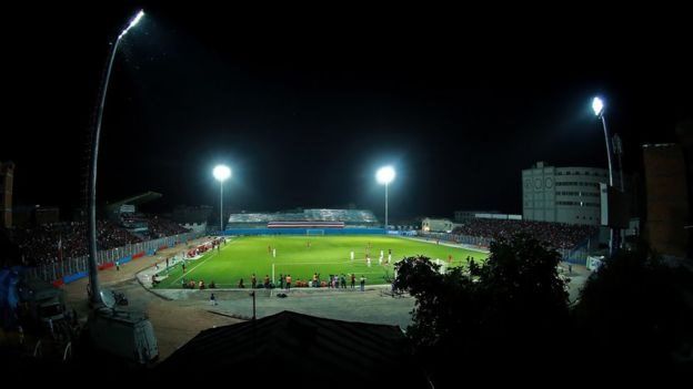 مصدر الصورةPARISA POURTAHERIANImage captionلقطة للملعب بعدسة المصورة الصحفية الإيرانية باريسا بوتاهيريانوأشاد الكثيرون بتصميم بوتاهيران على تغطية المباراة رغم القيود.